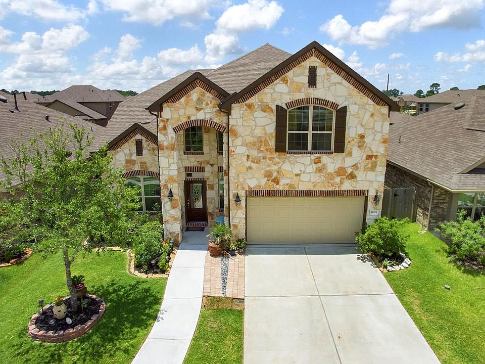 Better than new! Gorgeous stone exterior and lush landscaping offer stunning curb appeal. Open the front door to the soaring ceilings and warm, welcoming neutral tones. Gleaming kitchen is the heart of this home with stainless appliances and open to breakfast and living spaces. Enjoy a quiet, small dinner party or entertain a crowd for Sunday's game, this comfortable home can accommodate either with ease! Downstairs master bedroom and spa-like bath is the perfect place to wind down after a long day! Fabulous wrought iron staircase leads to large gameroom, perfect for media room, play space, or poker night! 3 generous secondary bedrooms and a full bath round out the upstairs. Sunny days are best enjoyed in the fresh air, and this backyard does not disappoint! Spend a cool evening roasting marshmallows by the firepit, a summer afternoon dining under the covered patio, or unleash your inner gardener! Plenty of space for a playset, pool, or just enjoy the wide open spaces! Welcome home!