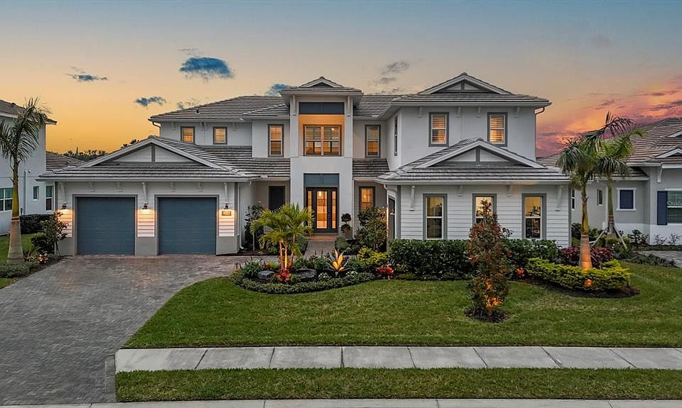 This custom-built lakefront estate in The Isles at Lakewood Ranch offers breathtaking water views, four bedrooms plus a versatile bonus room with an en-suite bath that could serve as a fifth bedroom, loft, office, 5.5 baths and nearly 5,000 square feet of opulent living space. Meticulously landscaped grounds and a split three-car garage welcome you. Enter through a custom glass front door to find exquisite porcelain tile flooring throughout the main living areas, enhancing the home’s refined elegance. Soaring 20-foot tray ceilings, custom plantation shutters, designer lighting and abundant natural light elevate the two-story living area, featuring a custom-built entertainment center designed to enrich your living experience. The chef’s kitchen is a culinary masterpiece, equipped with top-tier appliances, a gas stove, quartz countertops, a spacious island with breakfast bar seating and an expansive pantry. A reverse osmosis system ensures pristine water. The kitchen flows seamlessly into the grand living and dining areas, ideal for entertaining. The generously proportioned primary suite is a serene retreat with a tray ceiling, custom plantation shutters, two built-in walk-in closets and a spa-inspired en-suite bath featuring dual vanities, a soaking tub, an oversized shower with dual shower heads and additional closets for maximum storage. Downstairs, you’ll also find a refined office, a private guest suite with an en-suite bath, a mudroom with custom built-ins and a beautifully appointed laundry room with cabinetry. Upstairs, the open loft overlooks the grand living area below, complemented by two additional guest suites with en-suite baths, as well as a bonus/media room suite that could also serve as a fifth bedroom. The outdoor living space is a resort-style lanai with a tongue-and-groove wood ceiling, a heated saltwater pool, spa, fountains, and an expansive outdoor kitchen with custom cabinetry and stainless-steel backsplash, all offering spectacular views of the lake. Additional features include a whole-house generator, water softener, in-wall pest system, designer lighting and luxurious finishes throughout. The Isles at Lakewood Ranch offers world-class amenities, including a clubhouse, fitness center, resort-style pool, walking trails and tennis courts, along with top-rated schools, golf courses, parks, shopping, dining and easy access to Gulf Coast beaches. This home exemplifies unparalleled luxury living in Lakewood Ranch.
