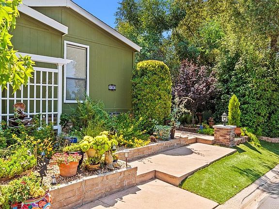 1984 BEAUTIFUL MANUFACTURED HOME WITH A LARGE CARPORT, LOVELY LANDSCAPED BACK YARD, PLUS 3 BEDROOMS!! Offered for $370,000 and sits at 2300 esf. 3 bedrooms, 2 full baths, and the 3rd bedroom which was added-on has a separate entrance and access to a back yard patio. It can be used as a bedroom for a caretaker, an office, a crafting or sewing area, plus more. This home has remarkable landscaping and outdoor seating. Mature fruit trees that include an apple, orange, pomegranate, and avocado. The Primary bath has a soaking tub plus a large shower and dual sinks. The Primary bedroom has an amazing walk-in closet that you can walk in and also walk through. It has plenty of room for clothes and other items. This home is breath taking and a must see. This home is located in lovely Skyline Ranch Country Club, a premier Senior Park that sits in the foothills of Valley Center. Currently offering FREE golf to all residents, full clubhouse use, gym, and a gated community and much more. Skyline Ranch is a land-leased park, the monthly space rent here is 1600.00. Park application and approval is required. Please come and see this wonderful home located in a great Sinor 55/45 Park with many amenities.