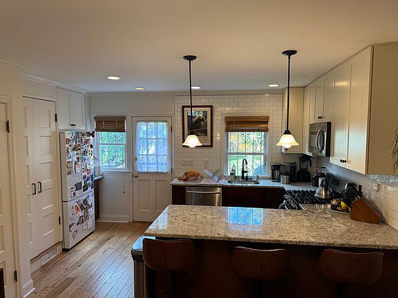 Renovated kitchen with granite countertops and bar seating