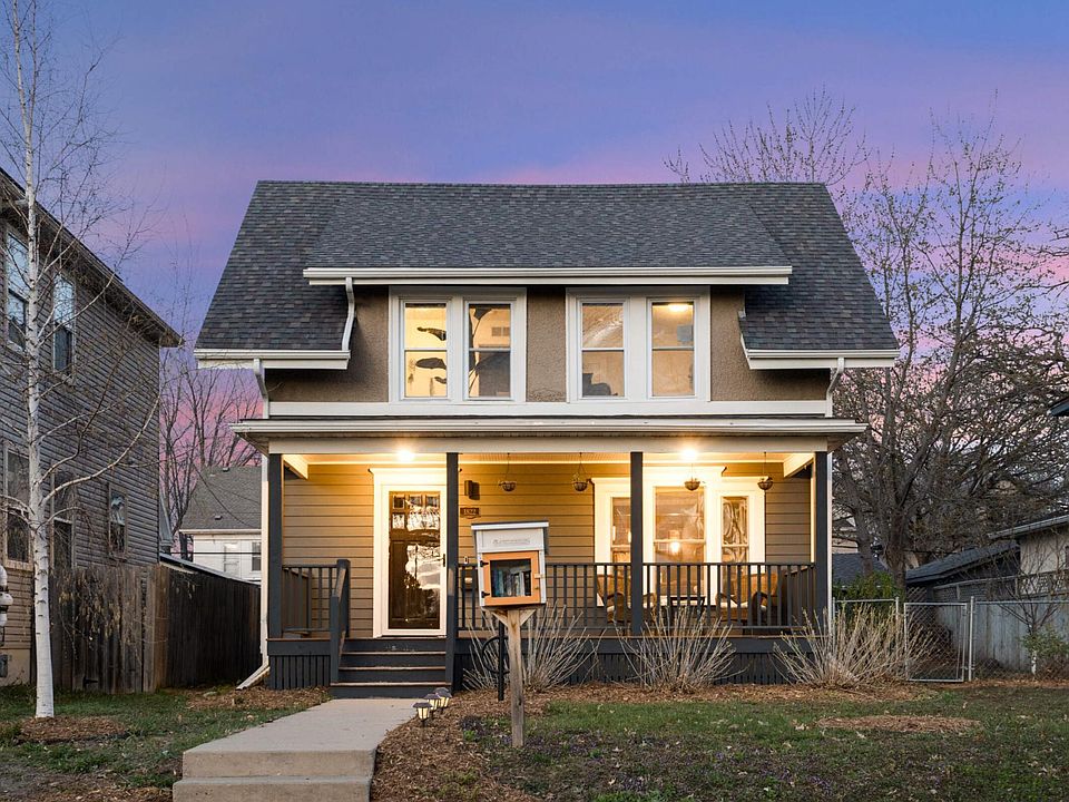 Step into this charming home with timeless appeal. The inviting front porch welcomes you, ideal for enjoying your morning coffee or watching the sunset. Inside, hardwood floors grace the main level, complemented by natural woodwork and a beamed ceiling, creating an atmosphere of refined comfort. The formal dining room, featuring a built-in buffet, is perfect for entertaining guests. Natural light floods the space, enhancing the bright and airy ambiance. Storage solutions seamlessly blend into the mudroom for organizational convenience. Upstairs, three bedrooms offer convenience, with the primary bedroom boasting an additional space for relaxation or work. Outside, a patio beckons for dining and relaxation, while the fenced yard ensures privacy and security. Explore the newly constructed protected bike lanes leading to Northeast, North Loop, and Theodore Wirth Park, or simply stroll down the street to discover Breaking Bread Cafe and Cookie Cart. Embrace the vibrant urban lifestyle!