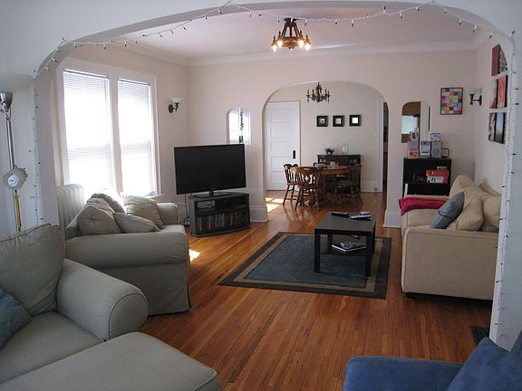 Please call (voicemail if you don't get me) to set up a showing. Classic 1920s top-floor two-bedroom plus sunroom and dining room. Hardwood floors, dishwasher, front and rear entrances. Garage available for additional rent. Located in great neighborhood close to shopping. No smoking and no pets. The above rent is for two people or fewer. Heat, water and trash/recycling collection included with rent.
