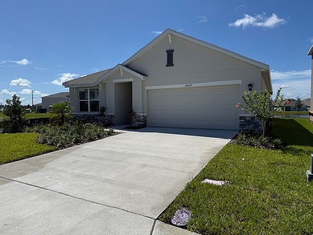 Beautiful, BRAND NEW HOME FOR YOU. Beautiful WATER VIEWS. Sit on the covered back porch and enjoy your morning coffee or nightcap. This spacious 3 bedroom / 2 bath home has an outstanding, open layout which optimizes the living space. One-story, two car garage layout. Open kitchen overlooks the living area and dining room, which include extended tile. The well-appointed kitchen features all new stainless steel appliances, including refrigerator, built-in dishwasher, electric range and microwave. Main bedroom is located at the back of the home for privacy features an en suite, large bath including dual sinks and vanity. The additional bedrooms share a bathroom. All kitchen and bath counters are solid stone and look amazing. The laundry room comes equipped with washer and dryer. Large garage and driveway for great parking. Beautiful outside landscaping. Modern look throughout and squeaky clean and fresh. Never lived in so you will be the first. Excellent landlord. 1,672 sq feet is more than enough for your needs. Community is awesome and features a community pool, pool area with covered eating areas and grilling availability, playgrounds and more. Great location in award-winning Lakewood Ranch and near stores, restaurants, library, parks and more.