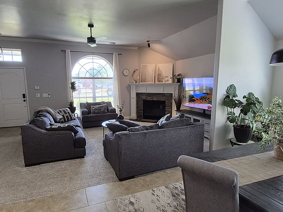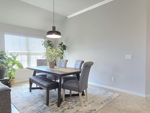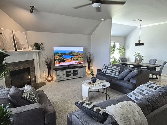 Inside, the main living and dining areas flow together, creating a warm, open feel that's perfect for everyday living. From the dining area, you'll transition easily into the semi-open kitchen, designed with dark wood cabinetry, granite countertops, and a raised breakfast bar for casual meals. At the far end of the kitchen, a cozy nook offers an excellent spot for a coffee setup or small workspace, with convenient access to the laundry room and garage. The living room is bright and inviting, featuring neutral tones, ample natural light, and a gas fireplace that serves as a comfortable focal point.