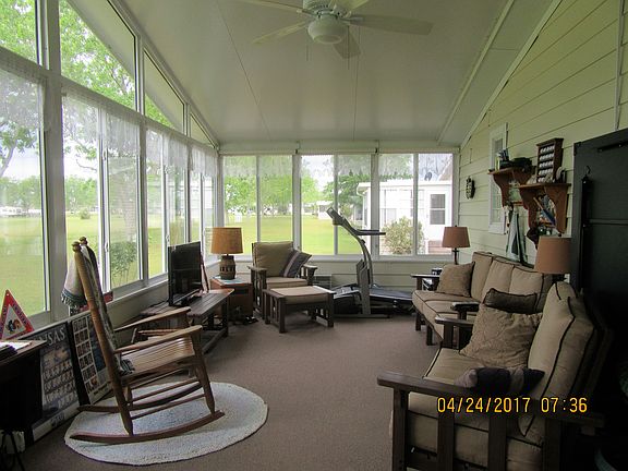 Jacobson 2011 Manufactured Home, 3 bedrooms, 2 baths with comfort height commodes. 4 seasons finished sun room. Central air and heat. Appliances include range/oven, microwave, refrigerator, dishwasher, garbage disposal. Washer and dryer and some furniture are optional. Flooring is ceramic tile, carpet and vinyl. Other interior features include ceiling fans, whole house exhaust fan, vaulted ceiling. Exterior features include 2 new storm doors, storage room, large front and back screened patios, covered carport, 3 vehicle driveway, insulated vinyl siding, shingled roof, lawn watering system.