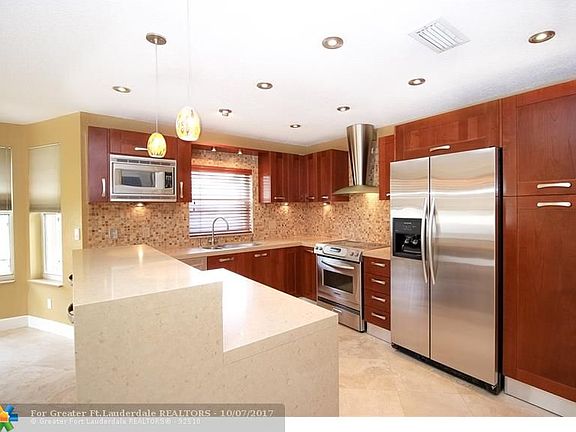 Stunning home completely remodeled! Kitchen has caesarstone countertops, real wood Italian cabinetry with soft close drawers and doors, decorative stone backsplash, built in bar in snack bar. Spectacular master bath and second full bath with all new top of the line fixtures, tiles, toilets, mirrors, etc. Custom lighting throughout home. Travertine on lower level, top quality laminate in bedrooms. Professional landscaping with lighting. Accordion shutters. Huge open space on side yard for privacy.