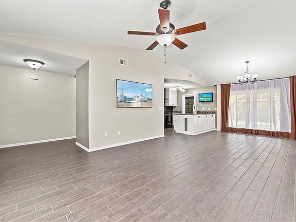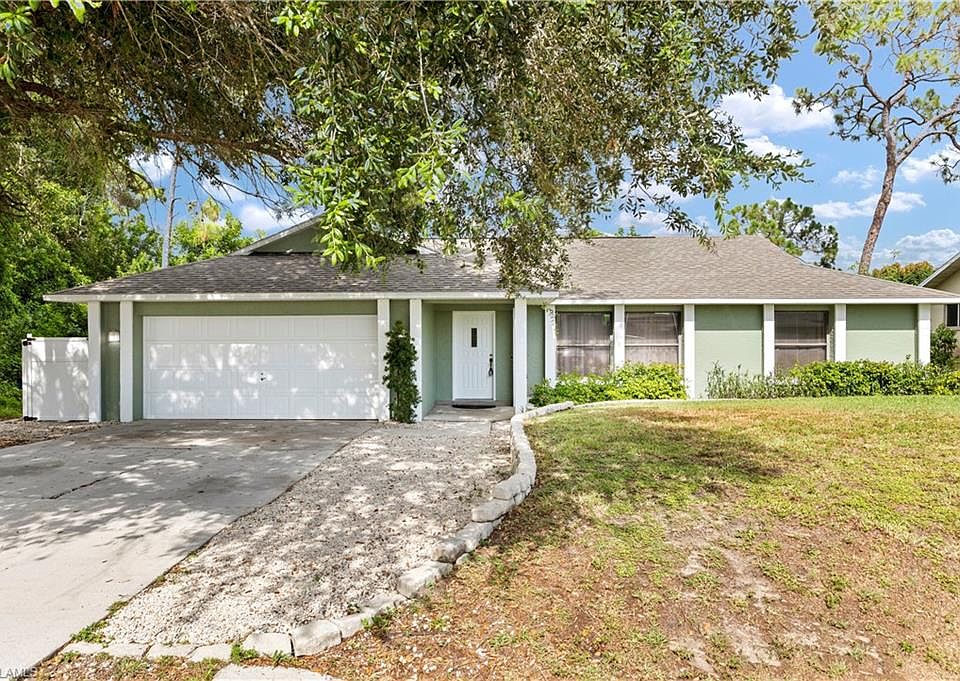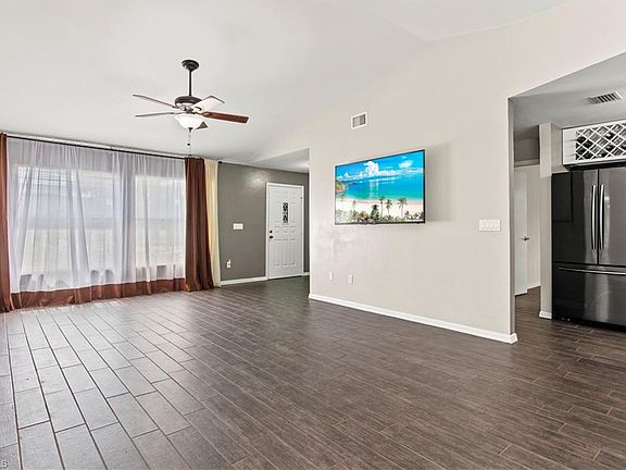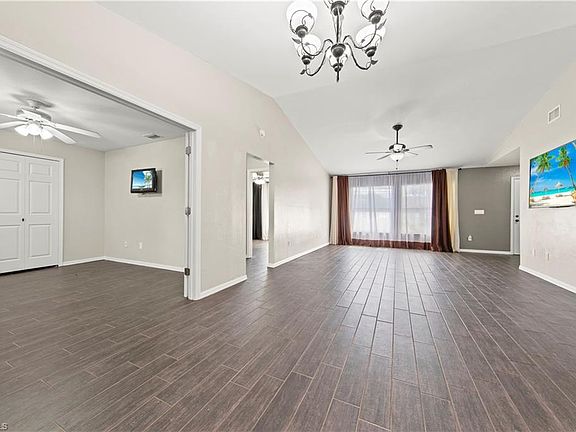 Great home in San Carlos Park! Three bedroom, two bath, one bedroom set up like a den. Guest baths doubles as future pool bath! Super open floorplan, feels larger than it is! Vaulted ceilings. Wood like Plank tile throughout most of home. Awesome kitchen, appliances about 3 years old, roof new in 2016, includes washer and dryer, move in ready, mostly repainted interior in neutral greys, exterior new paint, rear yard completely fenced and with a bamboo boarder! Super private and cute, yard also features fruit trees: MANGO, AVOCADO, LEMON, LIME, KEY LIME. This one will not last, easy to show and sell.