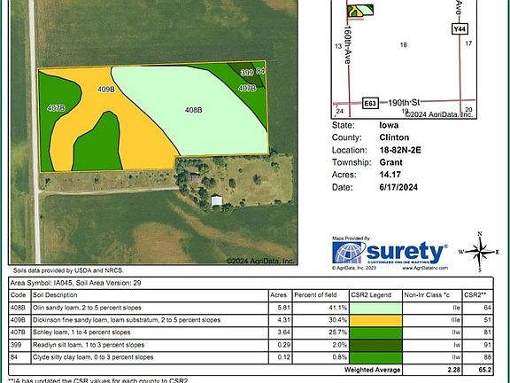 This is a nice Clinton County farm with productive soils. This farm would work well as a potential building site with income producing cropland. Primary soils are Olin, Dickinson and Schley. CSR2 on the 14.17 crop acres is 65.20. See soil map for detail. Seller has an additional tract of land for sale located northwest of this property. See Additional Land Aerial Photo.