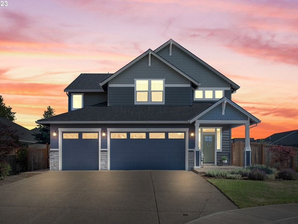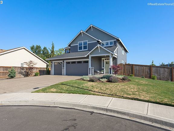 Welcome to this stunning and sophisticated newer custom home! Situated on a quiet cul-de-sac, this property offers a fantastic floor plan and an idyllic backyard that will fulfill your dreams!! Step inside the open and light-filled foyer leading to a beautifully designed floor plan. The highlight of this home is the impressive great room, featuring built-in shelving and a cozy gas fireplace. Large windows provide breathtaking views of the phenomenal backyard. The dining area connects seamlessly to the kitchen and features a sliding door that leads to the covered back patio, ideal for entertaining. The showstopper kitchen with rich slab quartz countertops creates a striking contrast, while the custom soft-close cabinetry adds warmth and character. Upstairs, the spacious vaulted primary suite with a walk-in closet is sure to impress. The spa-like primary bathroom boasts a luxurious soak tub, dual sinks, a floor-to-ceiling tiled shower, and elegant quartz countertops. Additionally, there are three generously sized bedrooms and a vaulted bonus room. Still need an extra room? The main level den is a versatile multi-use space. Step outside to the fully fenced rear yard, where a covered patio awaits. This private oasis is perfect for hosting gatherings or simply enjoying peaceful moments after a long day. The home also features a convenient laundry room with built-in cabinetry and a sink, as well as a three-car garage with epoxy flooring. Combining timeless Craftsman-style appeal with contemporary design elements, this home is a true gem. Its open floor plan, impeccable finishes, and well-appointed kitchen will surely impress. Don't miss your chance to make this home your own and experience the epitome of comfort and style. Conveniently located to schools, parks, Michelbook Golf Course, wineries, shopping, restaurants, and all that McMinnville has to offer, this property provides the perfect balance between tranquility and accessibility.