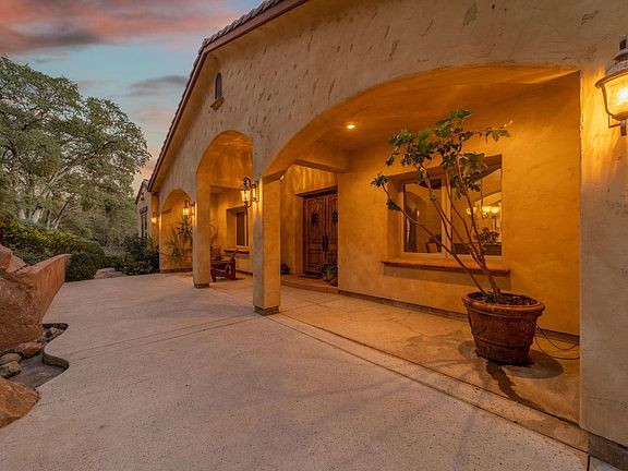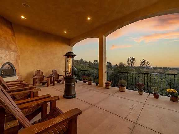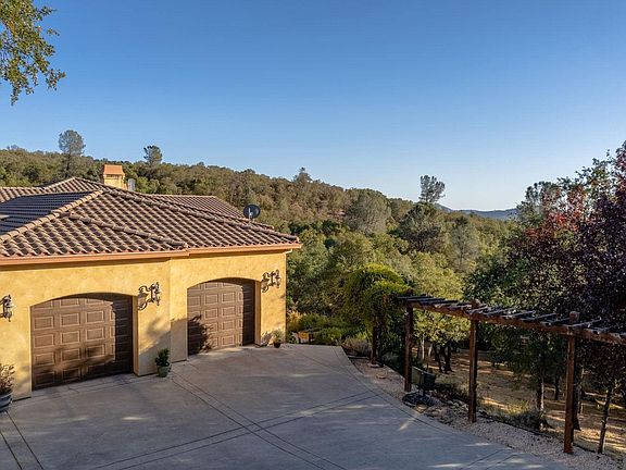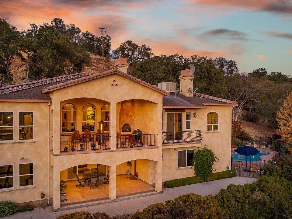 This exceptional Tuscan-style custom home, in the highly desirable neighborhood of Whispering Woods, is second to none. With expansive views, this 4,677 sf home includes 4 Bedrooms; 3 Full Bathrooms, Office and fitness center, ensuring there is plenty of room for all. This stunning home features cathedral ceilings, 8 ft doors; travertine floors; 3 cozy fireplaces; 2 separate Laundry rooms (one up & one down); Indoor/Outdoor built-in Speakers; Dual zone HVAC system plus a Radiant floors heating system throughout. The Gourmet Kitchen includes an oversized granite island w/ Prep sink and breakfast bar; 48" Gas Range w/ Grill; Stainless appliances; a breakfast nook and a generous walk-in pantry w/ 2nd refrigerator. The main level Master Bedrooms highlights a private step-out balcony to enjoy the sunset views; two spacious closets; and a see-through propane fireplace into the Master Bathroom, with jetted tub, and a walk-in shower with dual heads. The two downstairs guest bedrooms each feature walk-in closets. The downstairs Family Room / Game Room is well equipped with a pool table; wet bar; kitchenette; wine storage ; and access to the lower covered patio, perfect for entertaining. There is also a sizeable mechanical / utility / storage room with 2nd laundry room downstairs and a roll up door to the yard. Outdoor living showcases an amazing covered balcony with gas fireplace and incredible views of the nearby vineyards and surrounding mountains; swimming pool; 5.45 acres of complete privacy; dog run & chicken coop; seasonal creek and low maintenance yard. In addition this gorgeous home comes equipped with security system and Generator with transfer switch for occasional power outages. Enjoy nearby hiking, biking, boating & water sports, as well as day trips to Yosemite National Park, Pinecrest Lake, Dodge Ridge Ski Resort, local wineries, Sonora Pass and more. Only a few hours drive to the Bay Area. Call for your showing today!