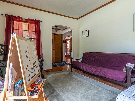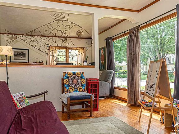 Loads of Charm in this Vintage home located in Barker Neighborhood & close to downtown. Lots of space with storybook charm. Natural light in Family room, dining room & kitchen areas. Covered front porch and nice enclosed porch off kitchen dining area exiting to back yard. Main level has large bedrm close to full bath. Nice wood decorative banister on stairs to 2nd level. 2 living areas - Oak Floors and knotty pine full basement (finished bsmnt space not in sq. ft. count) Studio in detached garage