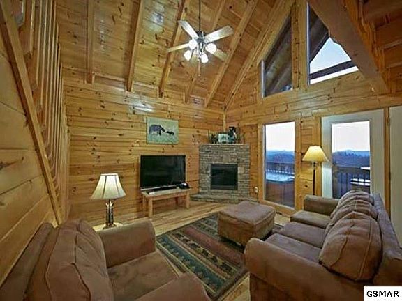 Enjoy the endless mountain views from this 3 bedroom cabin. There is a bedroom on all three levels. Access one of the 2 decks to watch the sunset. Equipped with 4 Queen size beds and 2 Queen size sleeper sofas this cabin can sleep up to 12 people. The theater features a 70 inch HD TV and comfortable seating. This cabin was rented 308 night in 2019. This view and the comfortable amenities are key to the success of this cabin.