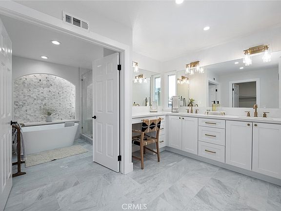 The master bathroom is a sight to behold, equipped with double vanities sporting contemporary brushed bronze fixtures. The centerpiece is an exquisite free-standing tub accompanied by a spacious walk-in shower adorned with luxurious marble finishes.