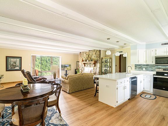 Step into the rear-covered sunroom to behold breathtaking year-round mountain views of the Smokies. Indoors, a grand living room welcomes you with a mountain stone gas fireplace, promising cozy evenings by the fireside. The open dining area seamlessly merges with a full kitchen, featuring quartz countertops and all-new stainless steel appliances—creating an inviting space for hosting gatherings. The primary bedroom boasts a private bathroom, while the second bedroom offers ample space, convenient access to an adjacent bathroom, and both have spacious closets.