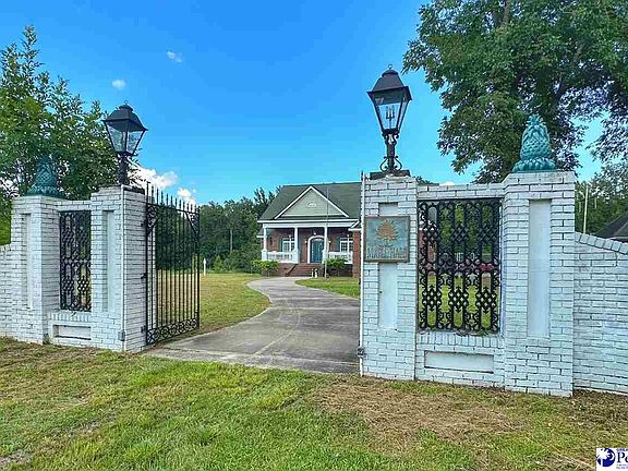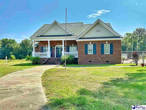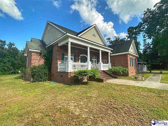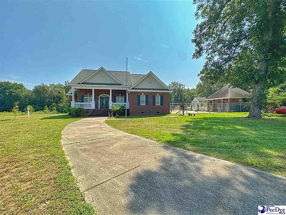 This charming country colonial home sits on almost 4.5 acres of land in the county limits. Three bedrooms, two baths, dining room, sitting room, den, &kitchen. There is a brick patio that connects the home with a carriage house from the garage. It is a bedroom studio with a full bath, temperature control... Great guesthouse. Outside of the carriage house there is a temp controlled doghouse with its own fenced in play yard. This home was built in 2006. It is a modified southern living house plan. The brick on the exterior is a Savannah style sand faced brick with matching mortar. It has a beautiful front porch with ceiling fans and a shellacked pine ceiling. Rocking chairs. Inside, the ceilings are 9 feet, 12 feet, and 16 feet in the master bedroom & bath. Windows on the back look out to a fountain on the back patio and a sweeping view of the woods. From here you can see our wildlife. Wild turkeys 15 today, deer, an eagle, and so many fascinating breeds of birds! The Little Pee Dee River is just beyond the back woods. Throughout the house are White Italian Calcutta marble floors and Rain Forest Brazilian cherry wood. The kitchen has a red marble floor and granite counter tops. There are plantation shutters on all the windows and customized drapes in the dining, sitting room, and master bedroom. These will stay with the house. There are nice architectural moldings around windows and doors. In the den is a large wood burning sand faced brick fireplace. Chandeliers, and recessed lighting are throughout the house. As you come in the driveway there are gorgeous giant pole light fixtures to light the way. Standing proudly in the front yard are two 100-year-old pecan trees that still produce. This almost 4 and a half acre parcel of land includes the main house, carriage house, the dog/chicken house, the "old country store" and surrounding acreage. The country store has electric and plumbing within it, as well as a full bathroom.