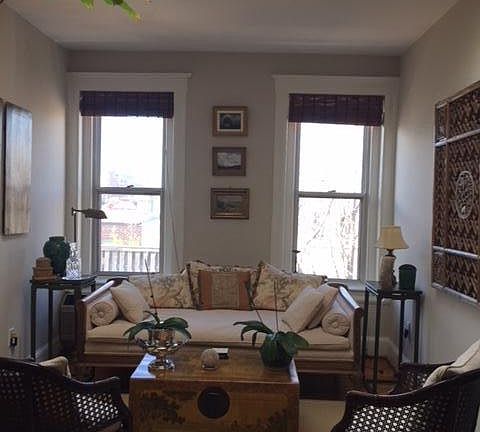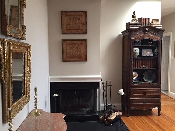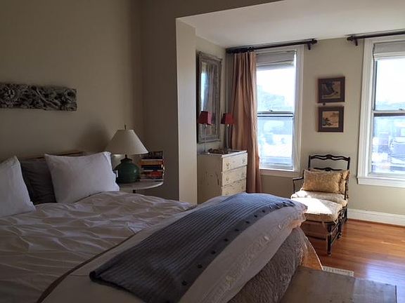 This spacious, penthouse-level corner unit at The Sagamore is flooded with light from a huge skylight and south, west-facing windows. This approximately 1,000-square-foot apartment provides a wonderful living room with wood burning fireplace, separate dining area, two large bedrooms, updated kitchen, renovated bathroom with marble tile and counter top, hardwood floors, washer and dryer in the unit, and tons of closet space. The beautiful and quiet building with only 17 units offers a fabulous roof deck with panoramic city views. Located in the heart of Dupont Circle, short walk to the Metro, 14th St, Adams Morgan U St, Meridian Hill Park, and tons of restaurants, bars, and shops. Apartment is available unfurnished or partially furnished.