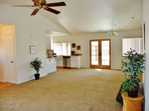 This home is in an area of larger estates... to the west of the City....just off a paved road....The property is 1.33 fenced acres & zoned for horses. As you approach, you will drive up the curved driveway...then walk thru the leaded glass door to a 1209 square foot home....with two bedrooms & one bath with two sinks. The main area is a large great room, kitchen with eating bar & inside laundry. There are dual pane windows, a French door to the covered patio, ceiling fans, walk-in closet in master bedroom & large linen closet. The detached garage is 576 sq feet with a patio in between garage & house. Garage has a 100 amp sub-panel. Natural gas and City water are definite pluses. The NEW: roof, fascia paint, new flooring (except kitchen), stainless appliances...dishwasher, microwave & natural gas range, can lights in kitchen, interior completely painted including bathroom & kitchen cabinets & scraped ceilings. This home is peaceful and has land to expand!
