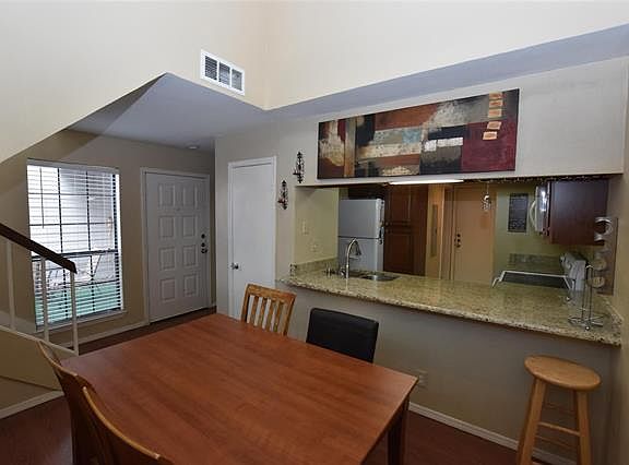 Impeccable two bedrooms & two baths fully remodeled condo feature outstanding living room space facing a cozy patio, very bright with oversized windows throughout. The first floor is perfect for entertaining, with spacious vaulted ceilings in the dining room adjacent to this lovely kitchen built with an upscale coffee bar. Just above two gorgeous masters with updated bathrooms featuring a relaxing jetted tub, spacious standing shower, & granite countertops vanities. This great community has friendly neighbors; beautiful mature trees make a quiet oasis from the city living, just perfect far North Dallas location located by shopping centers & minutes from major highways. Set up your view today; it won't last long