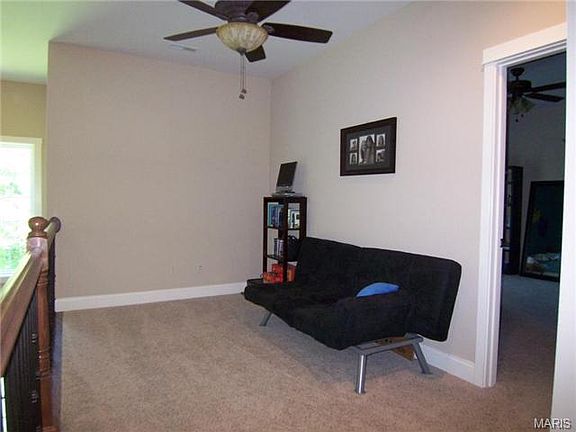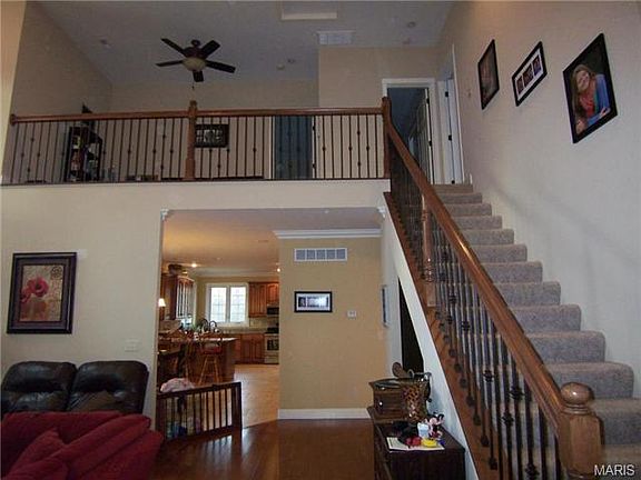 This 1 ½ Story Home is Large but Comfy. 3000 finished square feet with 4 Beds & 3 ½ Baths. The 2 story great room has a gas fireplace and an open loft above. There is a formal dining room just off the entry foyer. The fabulous kitchen has 42" Maple cabinets, granite counter tops, stainless appliances, a breakfast bar, planning desk, and a large pantry in the breakfast room. The main floor master has a 10' tray ceiling, luxurious bath, and walk in closet. The main floor also has a good sized laundry room and ½ bath. The 2nd floor has a loft area, 2 beds and a bath. The lower level has a 4th bed & bath, family room with fireplace, recreation room, office, a storage room, and a storm shelter. This home was built with high end materials and throughout the home you'll find 9' ceilings, 3 piece molding, and tall baseboards. Enjoy the outdoors with a covered maintenance free deck, covered patio, stone paved patio, and spacious lot backs up to common ground and trees. Home Warranty Included.
