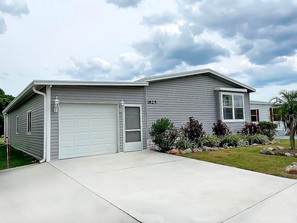 You will absolutely fall in love with this five year old home located right on the water and golf course! Tropically themed paint really reminds you that you are in Florida! You can watch the sunrise from your back porch every day! This two bedroom, two bath home with extra den is just lovely. The seller added a huge garage which spans the entire length of the home as well as a golf cart garage! The kitchen appliances have been replaced, backsplash was added and the washer/dryer come with the home. Call our sales team today to see this home because homes with garages don't last long!