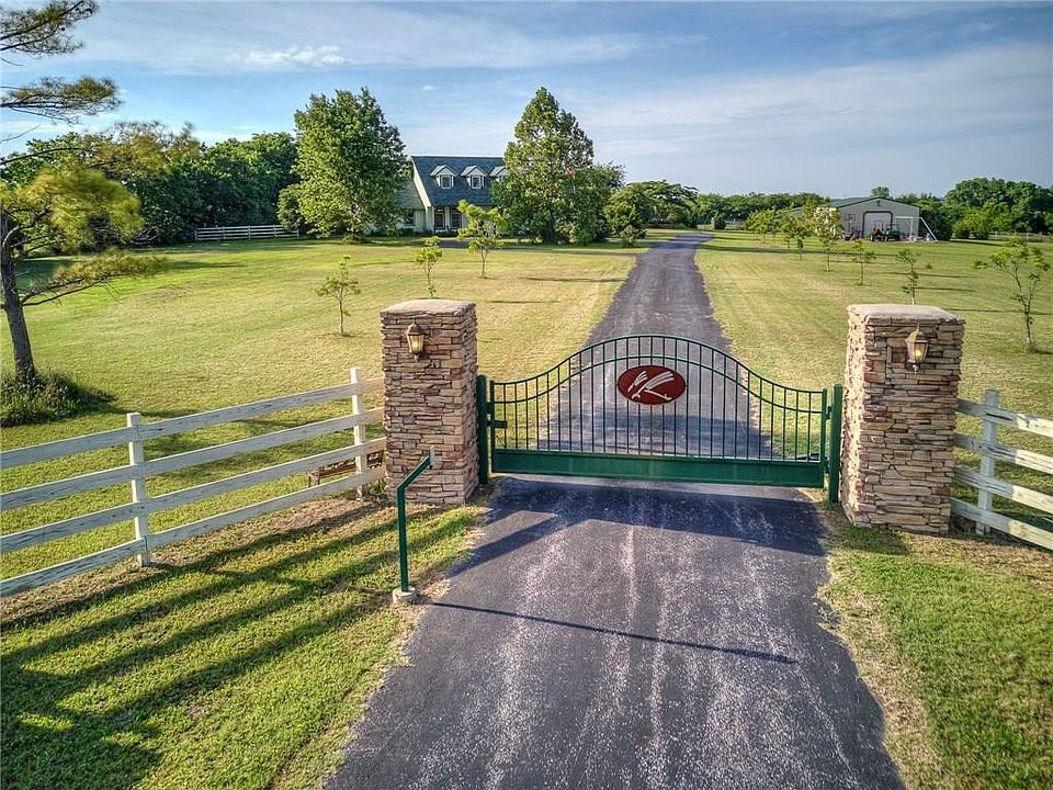 Beautiful, hard to find close in acreage in NE Norman! Located just across from Montecito Ranch, this 10 acre property boasts a gated entry, two barns, and a lovely 5 bedroom home. The spacious floor plan offers 5 generous bedrooms, 3 full bathrooms, formal dining, study, and an open living and kitchen area. Metal shop building with electricity plus a barn that once held horse stalls and could easily be used for that purpose again. The possibilities are endless, don't miss this one of a kind property!