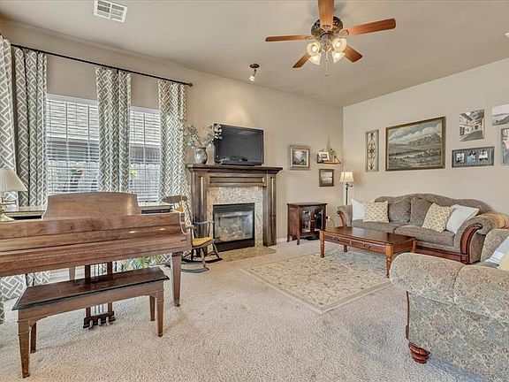 Come check out this gem! You are welcomed by a true entryway and office off to the left. Then, off to the living room with Florida ceiling, windows, a gas-log fireplace, and there is even room for a piano. Kitchen is partially open to the living room with bar seating, granite, walk-in pantry, stainless appliances and stain cabinetry. Main suite is spacious and has door to one of the patios. Main bathroom has jetted tub, shower, freshly painted cabinets, and Australian styled closet. Secondary bedrooms have walk-in closet and ceiling fans. Outback, you can see the sunrise off of one or two of your patios. There is plenty of room to entertain outback or run and play. Laundry room has drying rack and storage closet. Ample storage space throughout. Great location close to shopping and restaurants. HOA includes the gated entry, a park and green belt. New roof coming this month.
