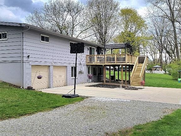 This 1344 sqft ranch is larger than appears from the street with a full semi-finished walkout Lower Level, situated on a private picturesque .6 Acre corner lot to watch the beautiful Sunsets. Features: Nice open floor plan, breaker box-2022, Roof-15, Huge sturdy deck w/ Pergola that can stay-21, large bedrooms, nicely updated main bath with new vanity-mirror-medicine cabinet, tons of off street parking with a horseshoe driveway in the front & a long driveway that has new concrete area-23 leading to the large 2 car garage in the rear, owners state there are Hardwood floors under the carpet on main floor, sliding door off the kitchen-21 leads to the deck, 23 x 22 Rec room in the walkout Lower Level that has 2 large windows and a half bath, new entry door leads to the large private yard. Lots of privacy!