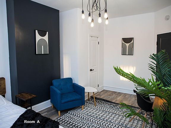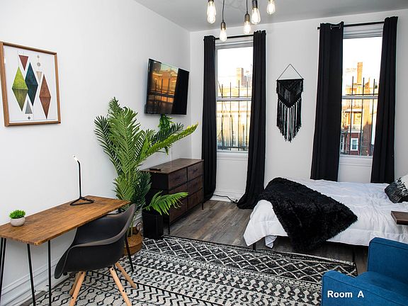 This is a fully furnished room on the third floor of this property. It comes with a shared full bathroom and large kitchen. It comes with a 50" smart TV that is hung and tall windows to give in plenty of sunlight. This unit has been fully remodeled! It has its thermostat to control your own temperature. 90 days minimum Smoking allowed:No