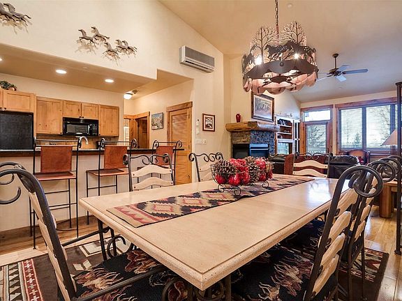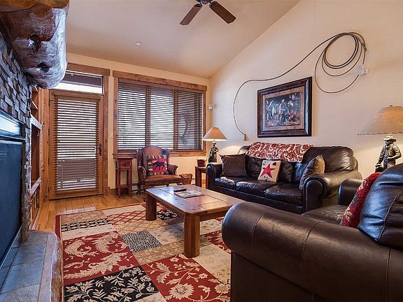 Enjoy this beautiful Champagne Lodge condo on your Steamboat Springs trip. Right when you walk in, you feel like you're home in this fully furnished turnkey residence. Enjoy the beautifully updated hardwood floors that extend throughout the entire home. This 2 bedroom/2 bathroom TOP FLOOR condo with elevator access is well appointed and perfect for any amount of time. Being on the top floor the ceilings are vaulted so you can enjoy the quiet without upstairs neighbors. The kitchen has everything you will need to enjoy eating in. The whole family can sit around this large and comfy dining room set to enjoy a home cook meal after a long day of skiing or hiking! The living room has more than enough space for all to snuggle up and watch your favorite movie on the large flat screen TV built into a beautiful entertainment center.