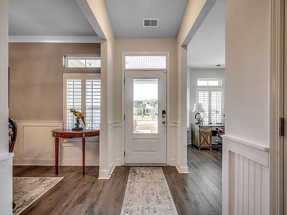 Come see this beautifully updated and appointed 3 bedroom, 2 bath home plus office/den that shows like a model! Built in 2019, this home is east of Hwy 17 in the gated, sidewalk & natural gas community of Seabrook Plantation. Home has approximately 2148 heated sqft and sits on almost 1/3 acre. The huge 3 car attached garage (29’x22’) and a long, wide driveway provide plenty of parking and extra storage if needed. The front door greets you with a nice sized front porch with room for seating. Upon entry, you’ll notice the high smooth ceilings and luxury vinyl plank flooring throughout most of the house with tile in the bathrooms and laundry room. The eat-in kitchen was upgraded with the gourmet package and features quartz countertops with subway tile backsplash, stagger height white cabinets with crown molding on top, soft close drawers and cabinet doors, pull-out shelving, large 5 burner gas stove, wall oven and microwave, large island with undermount sink and pendant lights, walk-in pantry, upgraded stainless steel Frigidaire Gallery appliances and an LG French-door refrigerator. Kitchen has bar seating at the island and a 10’x12’ breakfast nook. The 18’x21’ Great room has vaulted ceiling peaking at 12’ and a cozy gas log fireplace. The formal dining room (15’x11’) has contemporary crown molding, judges paneling with inlaid bead board, and a gorgeous chandelier. Throughout the home you will find plantation shutters and upgraded lighting fixtures. The Owners Suite features an 11.5’ vaulted ceiling, the 1st walk-in closet, large bathroom with 5’ tiled shower and transom window, water closet, large linen closet and a 2nd walk-in closet. Both guest bedrooms are 11’x11’ with ceiling fans. Guest bath has quartz countertops and a tub/shower combo. The nice-sized office/den has a bay window providing lots of sunlight and could easily be a 4th bedroom with the addition of French doors. Laundry room has side-by-side washer & dryer (both convey) with shelving above. The covered back porch is 22’ long, has approx. 220sqft for entertaining or relaxation, and looks out over a nice-sized backyard with views of trees. Home has an irrigation system all around and low maintenance landscaping with river rock beds. Other features of the home are Hardi board cement fiber siding, LED lighting in the garage, partially floored attic (in garage) for extra storage, Honeywell smart thermometer, a termite bait system, and a GenerLink system attached to electric meter to allow you to more safely and easily connect a portable generator to the house. Amenities in Seabrook include a community pool, exercise room and storage for RVs and boats (for an additional yearly fee). Seabrook Plantation is located right beside Coastal North Town Center with Publix, TJ Maxx, Dicks, PetSmart, Hobby Lobby and many other shops and restaurants. Seabrook is an easy golf cart ride to the many other areas of entertainment, shopping and restaurants in North Myrtle Beach….and don’t forget the sandy shores of the Atlantic Ocean! Come see this amazing home and subdivision today!
