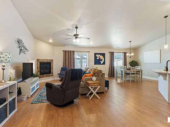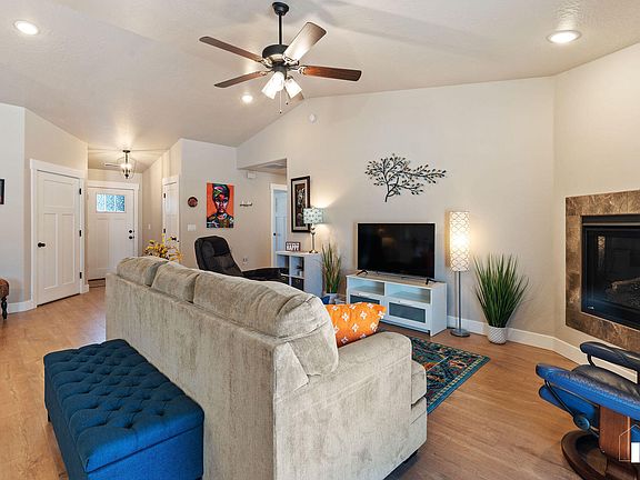 Immaculate owner occupied end unit with corner fireplace and spacious yard with extended cement slab and private side area. White 2 inch Norman blinds throughout the home and upgraded LVT flooring throughout as well. Drywall finished garage with soft water hookup. Xeriscape yard with weed barrier and drip system. This home looks like it's never been lived in
