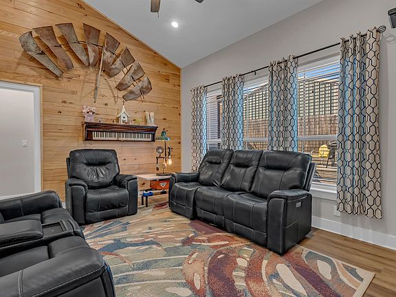 This 2021 home has been beautifully maintained and thoughtfully designed. The open-concept floor plan is ideal for both everyday living and entertaining. The kitchen showcases stainless steel appliances, granite countertops, a spacious center island perfect for gathering, and a designated dining area with plantation shutters and sliding doors leading to a private screened-in porch. The living area offers warmth and character with a custom wood accent wall and an inviting electric fireplace. The primary suite is a true retreat, highlighted by a show-stopping custom wood tray ceiling. Its ensuite bath features a dual vanity, elegantly tiled shower, private water closet, and a generous walk-in closet. Two additional bedrooms are pristine. The hall bath includes a tub with a striking tile surround. The finished garage extends functionality and opens to a custom detached double carport, providing ample covered parking. This home blends style, comfort, and careful craftsmanship—ready for its next owner to enjoy.
