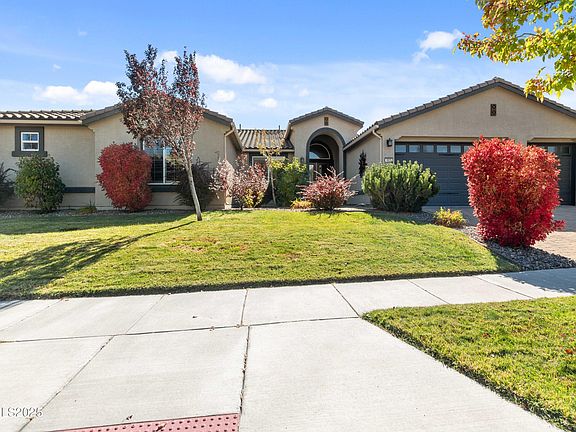 "Open house Saturday 10-18 from 12 to 3 pm" Welcome to your dream home in the prestigious Somersett Golf Community of Reno, Nevada! This stunning, newer residence boasts a desirable single-level open floor plan, perfect for entertaining family and friends. Step inside to discover elegant upgrades that mirror those found in the model home, including exquisite marble countertops and beautiful real hardwood flooring. One of the standout features of this home is the Tesla solar with a Powerwall, ensuring you're never left in the dark and virtually no power bills! The exterior is a gardener's paradise, adorned with an array of fruit trees, vibrant flowers, and aromatic herbs. Enjoy warm evenings on the expansive covered patio, ideal for hosting gatherings or simply relaxing outdoors. Additional highlights include ceiling fans in the main living area and all bedrooms for year-round comfort, an impeccably organized garage with hanging shelves, and soft-close drawers throughout the kitchen. Custom window treatments, including plantation shutters, add a touch of sophistication to every room. This home has been meticulously maintained and is in pristine condition. Don't miss your chance to own a piece of luxury in Somersett—schedule your showing today!