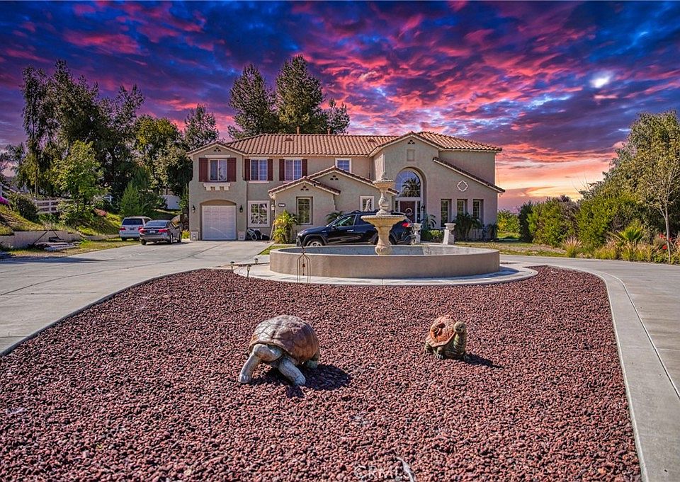 Drive home in STYLE! Nested in the Mockingbird Canyon Estates is this hidden gem, a 4 bedroom 4 bathroom home with expansive and elegant private driveway and a fountain center piece. Stepping through the front door onto beautiful marble flooring you are immediately drawn in with an expansive architectural design that frames the formal living room and dining room, that has been painted by a local artist and is unique to this property. The open concept floor plan leads you into the family room with a cozy fireplace, and easy access to the gourmet kitchen featuring barstool seating, double oven, wine fridge, gas range, large island, with a huge walk in pantry! Down the hallway is a powder room for guests, a large office area just off the main floor bedroom suite. Double staircases take you upstairs to two large bedrooms, a loft area, and hall bathroom with double sinks. The master suite is the perfect place to relax after a long day, with your own fireplace, seating area, huge balcony, and a master bath with a jacuzzi tub, double sink vanity and a huge walk in closet! Like to entertain outdoors? This home is move in ready! Turnkey! Come and check it out yourself.