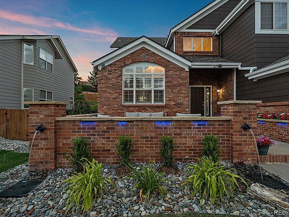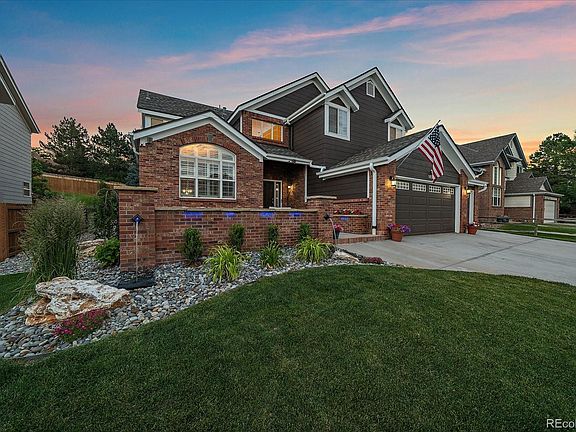Amazing curb appeal that boasts the front patio with gorgeous water fountains, lighted brick patio with flowers and built-in gas fire pit to enjoy your days and evenings outside. The flower pots offer easy maintenance with hassle free smart watering. Welcome to this distinguished five-bedroom home, quietly situated between two tranquil cul-de-sacs. The grand entrance reveals quartz-adorned spiral staircase, wrought iron railing and soaring vaulted ceilings. Freshly remodeled, the house boasts real hardwood floors throughout, enhancing its timeless elegance. The versatile main floor bedroom also serves as a study, complete with custom-built shelves. Throughout the house, you'll appreciate details like wainscoting, tall baseboards, crown molding, as well as plantation shutters on the main floor. The kitchen, full of unique character, showcases granite countertops, natural stone backsplash and walk-in pantry that complement many culinary endeavors. Upstairs feature two newly updated bathrooms with quartz counters and laminate flooring. One secondary bedroom features a walk-in closet and another secondary bedroom has custom built-in shelving. Descend to the finished basement to discover a cozy fireplace, wet bar, and a standout stone accent wall. The property features a spacious 3-car garage. The private backyard retreat has a built-in hot tub, the soothing sound of a tranquil cascading waterfall, and an open-space backdrop. A new HVAC system, a whole house fan, a humidifier, and a new roof ensure all-year-round comfort. Located within the respected Cherry Creek School District, enjoy access to a community pool, park, and year-round activities. Note: the broker is related to the sellers.