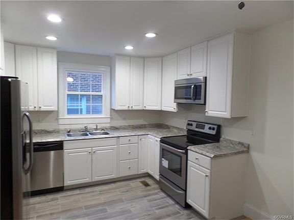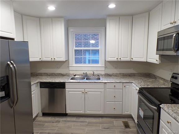 Stunning renovation of this brick cape cod in the Walnut Hill area of Petersburg. Almost 1500 sq ft of finished living space in this home with 2 bedrooms with new ceiling fans and a full bath downstairs and 2 bedrooms and a full bath upstairs. A new 2.5 ton heat pump with new duct work has been installed along with new windows, interior and exterior doors, gutters, paint and insulation & vapor barrier in the crawl space. The kitchen features new white cabinets, counter tops, ceramic tile flooring, stainless steel appliances, recessed lighting and fixtures. The living room and dining area both have new ceiling fans. The downstairs bathroom has a new tub and surround, vanity, mirror, light fixtures, toilet, vinyl flooring and fixtures. The downstairs hardwood floors have been refinished along with the steps going upstairs. The 2 bedrooms and hallway upstairs have new carpet. The upstairs bathroom has a new vanity, vinyl flooring, mirror, light fixtures, toilet and fixtures. The rear screened porch has new screens, door and light fixture and the porch floor has been painted. Also the partially fenced in back yard has a shed.