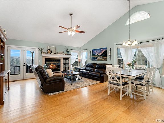 Beautifully updated ranch in The Woodlands! This gem offers one-of-a-kind views and a myriad of high-quality upgrades. Nestled against a stunning backdrop that includes the iconic Castle Rock, this home is a haven of tranquility and scenic beauty. The open floor plan unfolds beneath vaulted ceilings, enhancing the spacious feel of the home. Laminate bamboo flooring extends throughout, leading you to the heart of the home where large windows frame breathtaking views and bathe the space in natural light. The living room offers the perfect setting for cozy evenings with a wood-burning fireplace. The kitchen features stylish solid surface counters, stainless steel appliances, and an abundance of soft-close cabinets. The large primary suite flaunts lush views and an ensuite bathroom with dual sinks. Two additional bedrooms on the main level ensure ample space for family. The walkout basement houses an expansive recreation area with another fireplace, an office with elegant French doors, an additional bedroom, and a bonus space currently set up as a gym and storage area. The professionally landscaped backyard boasts a Trex deck and opens to acres of preserved open space. Living in The Woodlands means embracing a lifestyle of outdoor enjoyment and community amenities, with trails, parks, and a recreation center all within walking distance. Important updates include a new roof in 2017, new flooring and exterior painting in 2020, and new windows around the same year, ensuring this home is as practical as it is beautiful. This property is a sanctuary, offering peace, privacy, and pristine surroundings with the assurance of no future developments encroaching on your green space!