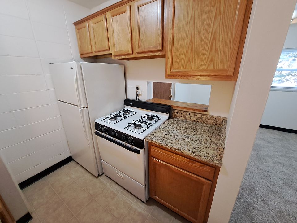 Modern and stylish white appliances, paired with granite countertops for a polished look.