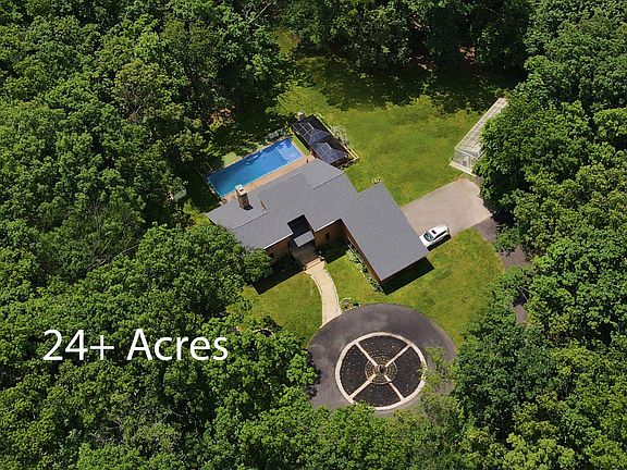 Escape to Paradise! This home offers peace and serenity. A Gorgeous contemporary home, hidden within 24+ acres of woods. A Nature Lovers Paradise with a lot of wildlife! Brand New Roof (5/28/24) with 10 year warrantee to the new owner. Automated and easy to use large custom solar powered hydroponic greenhouse. An easy to care for 40 capacity chicken coop. First Floor Master Bedroom. 2 1/2 baths (Super master bath with large sunken jetted tub). 2 Huge guest bedrooms with massive walk in closets. A Large home office attached to one of the bedrooms. 2 car finished Garage with a large work space. Stunning Great Room with Soaring ceilings. Fireplace mounted 75" 4k TV. 2nd floor nook for a reading or workout area. Impressive Floor to ceiling Stone Fireplace with a high efficiency wood burning insert. Private log splitting area with plenty of trees 5 min to the closest boat ramp! Brick patio with dual gazebos with an outdoor fireplace. Impressive display of perennial flowers surrounding the home. Fiberglass 50ft inground easy to care for pool. Brand new well pump (9/15/23) with upgraded water pressure. 30 Gallon fresh water backup system with a healthy reverse osmosis drinking water filtration system. Privacy, Tranquility, and Quiet allow you a better connection to nature.