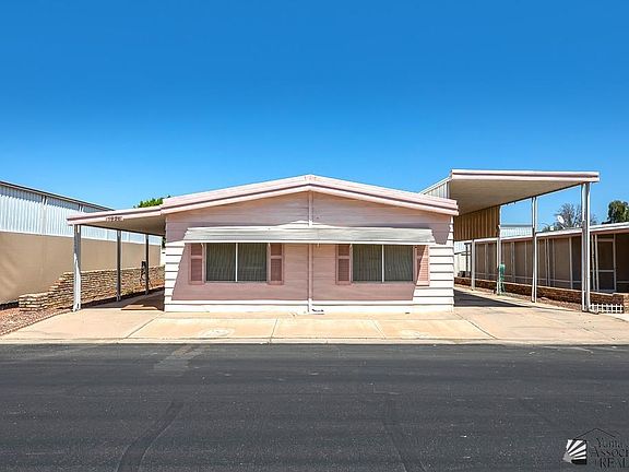 Affordable home at Casa Manana with a spacious living and dining area with a built in hutch. Kitchen has a convenient breakfast bar, lots of cabinetry, dishwasher, refrigerator and flat top stove. Hall bath has a shower, primary bedroom with built in drawers, mirror door closets and a full bathroom with more storage. Indoor laundry room, covered patios, and storage sheds. Casa Manana Estates is an upbeat lively 55+ community located in the heart of Yuma close to the hospital, medical, shopping, library,walking/bike path, and restaurants. HOA clubhouse, saltwater pool & spa, shuffleboards, pool table, library, TV, potlucks, dances,luncheons, holiday celebrations, silent auction, BBQs, line dancing, poker, card games, water aerobics, and more fun! For clarification, the HOA amenities are NOT on subject property and are clearly marked on photos.