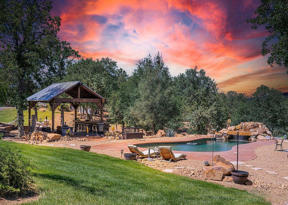 A Custom Elevated Farmhouse with views of Shasta, Lassen and Whiskeytown.You have to see this wonderful home to appreciate all it has to offer! Quality finishes, design and function make this home so appealing! Largeopen concept, split floor plan and expansive covered front porch. Watch the children play or swim in the saltwater pool or look after your farm animals. The play structure will be the envy of your kids friends just as the primary bath and kitchen will be for the adults! Just to ensure nobody feels left out; large shop/barn, outdoor shower, and yoga deck. Entire property is fenced and portions are cross fenced for those animals!! A custom gate welcomes you to this property that will make you relax and stay awhile! This recently painted home has many updates and upgrades to li