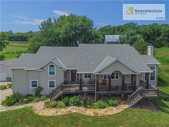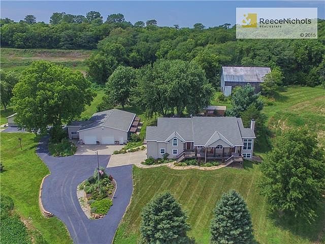 Country Elegance Ranch Style Custom Built home by John Miller on 23 acres of land! Privacy & 25 min to KCI! Interior design perfect for relaxing, entertaining & hobbies. From Vaulted Beamed ceilings to rich Granite Countertops in kitchen,baths & wet bar! Open floor plan, split bedrooms, 4 full baths & lower level w/ Wet Bar &Wine Room. Geothermal w/extra insulation make this home so efficient. Included 60 x 40 garage w/ separate living quarters, 35 x 35 machine shed, Tillable acreage, gardens, older barn! MUST SEE!
