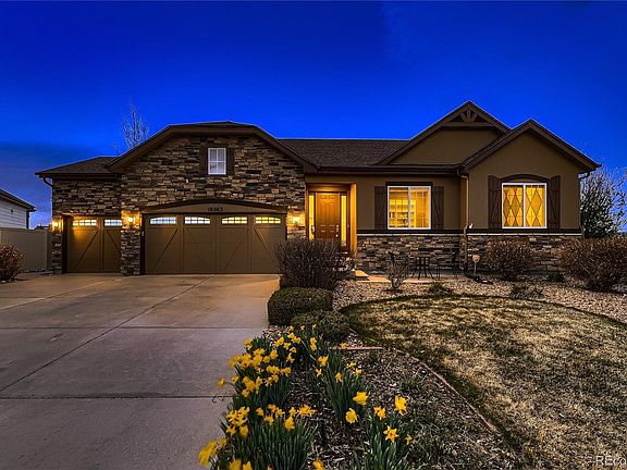 Nestled in the heart of Parker, this stunning former model home is located on a cul-de-sac in the extremely desirable Horseshoe Ridge Community. Discover an enclave of design and comfort where the blend of luxury and homeliness creates a sanctuary for the senses. Picture warm, earth-toned hues greeting you as you traverse on the gleaming hardwood floor from the front entry through the living room to the kitchen. An entertainer's dream, the gourmet kitchen is adorned with upgraded slab granite countertops, a large island, a 5-burner gas cooktop, double ovens and stainless steel appliances. Some of the designer touches include coffered ceilings in the living room, dining room and primary bedroom. The primary bedroom is enveloped in soothing colors, that promise restful slumber. The ensuite 5-piece primary bathroom has a blend of elegance and function with its tasteful accents and a generous space walk-in closet. French doors off the hallway open into a dedicated office space, complete with built-in bookshelves, providing a quiet spot for work or study. Rounding out the main level is another bedroom and a full bath with dual vanities. The professionally finished basement has a spacious family room to watch movies or play board games. It also has 2 more bedrooms, a 3/4 bathroom and a storage area. The oversized 3-car garage is drywalled and provides ample room for vehicles, storage or even a workshop. A new hail-resistant roof and new exterior paint were just completed in 2023. Trails and parks surround the neighborhood providing the perfect Colorado lifestyle. Walking distance to Salisbury Sports & Equestrian Park and Cherry Creek trails. With easy access to Main Street in Downtown Parker, Reuter-Hess Reservoir, and I-25, this is home is ideally situated. Imagine your life in this sanctuary, where every day is a new opportunity to create lasting memories. This is not just a home; it's the next chapter in your story. We welcome you to experience the allure first-hand.