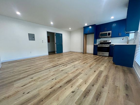 Step inside to an open-concept living space featuring wide-plank wood-style flooring, recessed lighting, and plenty of natural sunlight from large dual-pane windows. The layout flows seamlessly into a modern kitchen outfitted with deep blue shaker cabinets, brushed-gold hardware, quartz countertops, a farmhouse sink, and stainless steel appliances, including a gas range and built-in microwave.