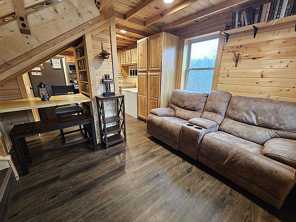 The meticulously crafted 1-bedroom, 1-bath home offers cathedral ceilings and pine finishes complemented by a spacious loft and an office/sitting area with dedicated desk space. High-speed Spectrum Fiber is already installed, ensuring reliable connectivity even in this rural setting.