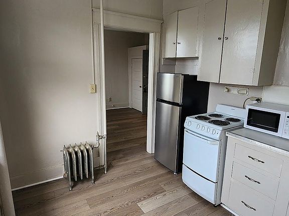 Move-in ready large studio/one-bedroom, shared bathroom apartment located in a convenient location downtown, within walking distance to store, restaurants Just refreshed with new flooring, new paints, blinds, new fridge etc The owner pays for water/sewer, garbage, gas , hot water, heating. The tenant pays only the electricity. Shared bathroom. Large private parking