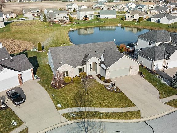 This well-maintained 3 bedroom, 2 1/2 bath home sits on a cul-de-sac and has a beautiful fountained pond in the back to enjoy on the patio. There are three large bedrooms with the master having a spacious walk-in closet and private master bath with dual sinks and natural light from glass block window over shower. The living room has cathedral ceilings and double-sided fireplace to the dining/kitchen. Three-season room overlooks the pond. Beautiful roomy kitchen has loads of cabinets with glass backsplash and breakfast bar that can seat 4. Oversized 2 1/2 car garage with utility sink and pull-down attic storage. Association dues include use of the clubhouse and the pool. Annual dues are only $275.