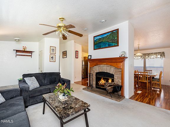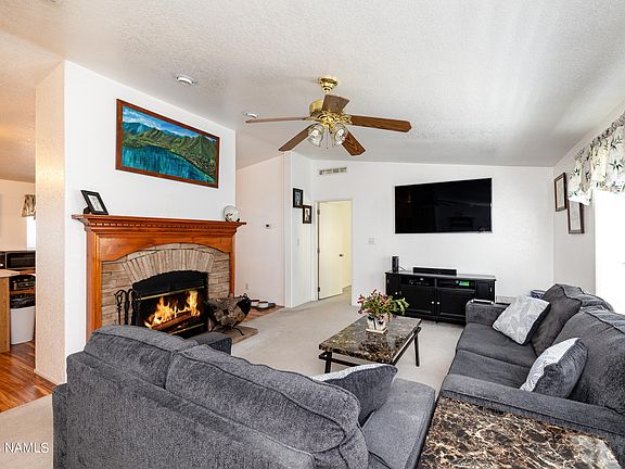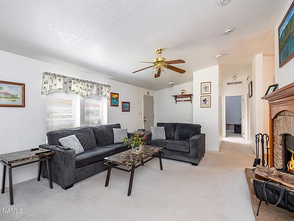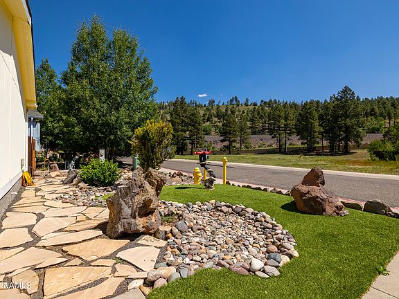 Affordable living in Flagstaff! This charming 3 bed, 2 bath manufactured home is immaculate and move-in ready. Nestled against open space, it offers unrivaled privacy within its fully fenced yard. Enter to the great room with vaulted ceilings and a stunning wood-burning fireplace. The well-appointed kitchen comes with all appliances included. Enjoy the split floor plan with the primary suite situated opposite the guestrooms. The primary suite boasts a spacious en-suite bathroom and ample closet space. Step outside to a generously sized fenced yard, fully landscaped, with mature peach and apricot trees. Additional features include a detached 2-car garage, a covered patio and much more. Conveniently located near a park, shopping, NAU, and the forest, this home has the ideal westside locale!