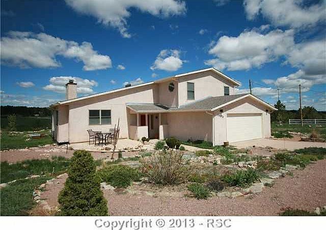 Great, two story home on almost 5 acres. Lot is completely ready for your horses, including a rare domestic well. Excellent access to both Highway 83 and County Road 105. Beautiful view of Pikes Peak and the front range mountains. Lots of new upgrades were done on the home in 2003 to include; stucco exterior, Pella Windows, slab granite countertops, hickory cabinets, stainless steel appliances, hardwood hickory flooring, 24X 36 barn, vinyl split rail fence and paved driveway.