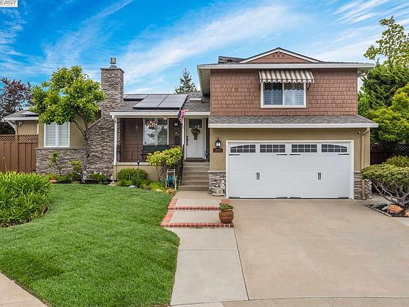 3 Bedroom 2.5 bathroom home with gorgeous backyard and interior. New roof and fully owned solar. Composite deck surrounded by stamped concrete. Large living room with gas fireplace. Large kitchen with high vaulted ceilings. Enjoy stainless steel appliances, quartz countertops, custom spice rack, pull out shelving, under and above cabinets, and ceiling fan. Spacious master bedroom with an attached full bathroom. Impressive master comes with a built in dual closet system. First floor den with wet bar and easy access to the backyard and jacuzzi. Well maintained backyard filled with mature dogwoods and redwoods. Backyard also has a storage shed. Safe and private cul-de-sac on an elevated lot. Access to some of the best schools in the Bay Area. Commute distance to Palo Alto, San Jose, San Francisco, and Walnut Creek. Come visit a gorgeous home with an entertaining and beautiful backyard and make it your own.